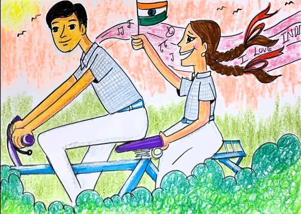 This joyful artwork beautifully captures the spirit of freedom, friendship, and patriotism through a lively cycling scene. Two school children are shown riding a bicycle together, smiling and enjoying the moment, symbolising unity and shared happiness. One child proudly waves the Indian flag, while flowing ribbons, music notes, and the words “I Love India” add movement and emotional energy to the artwork. The tricolour-inspired background, greenery, and flying birds enhance the festive and patriotic mood. Created using clear outlines, expressive figures, and vibrant colours, this artwork reflects confidence, imagination, and storytelling skills. It encourages children to express national pride, creativity, and positive emotions while learning figure drawing, colour balance, and composition in a fun way.