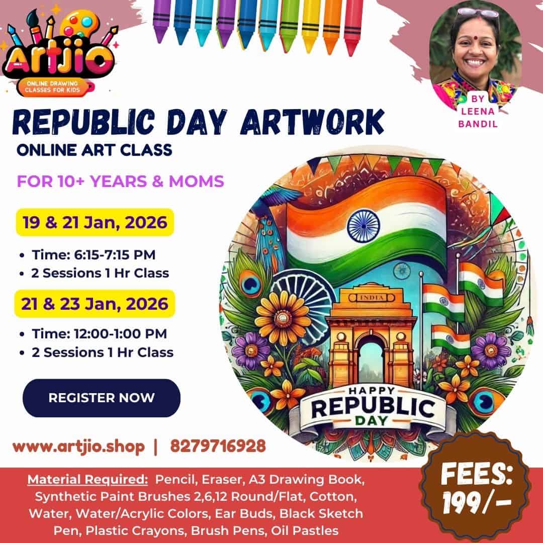 🇮🇳 Designed for 10+ years & moms, this vibrant Republic Day–themed artwork session helps learners explore colour harmony, detailing, and patriotic expression through a beautiful guided illustration. Participants will learn to draw iconic Republic Day elements step by step, building confidence while connecting with the spirit of India. The artwork shown in the poster is for reference only.