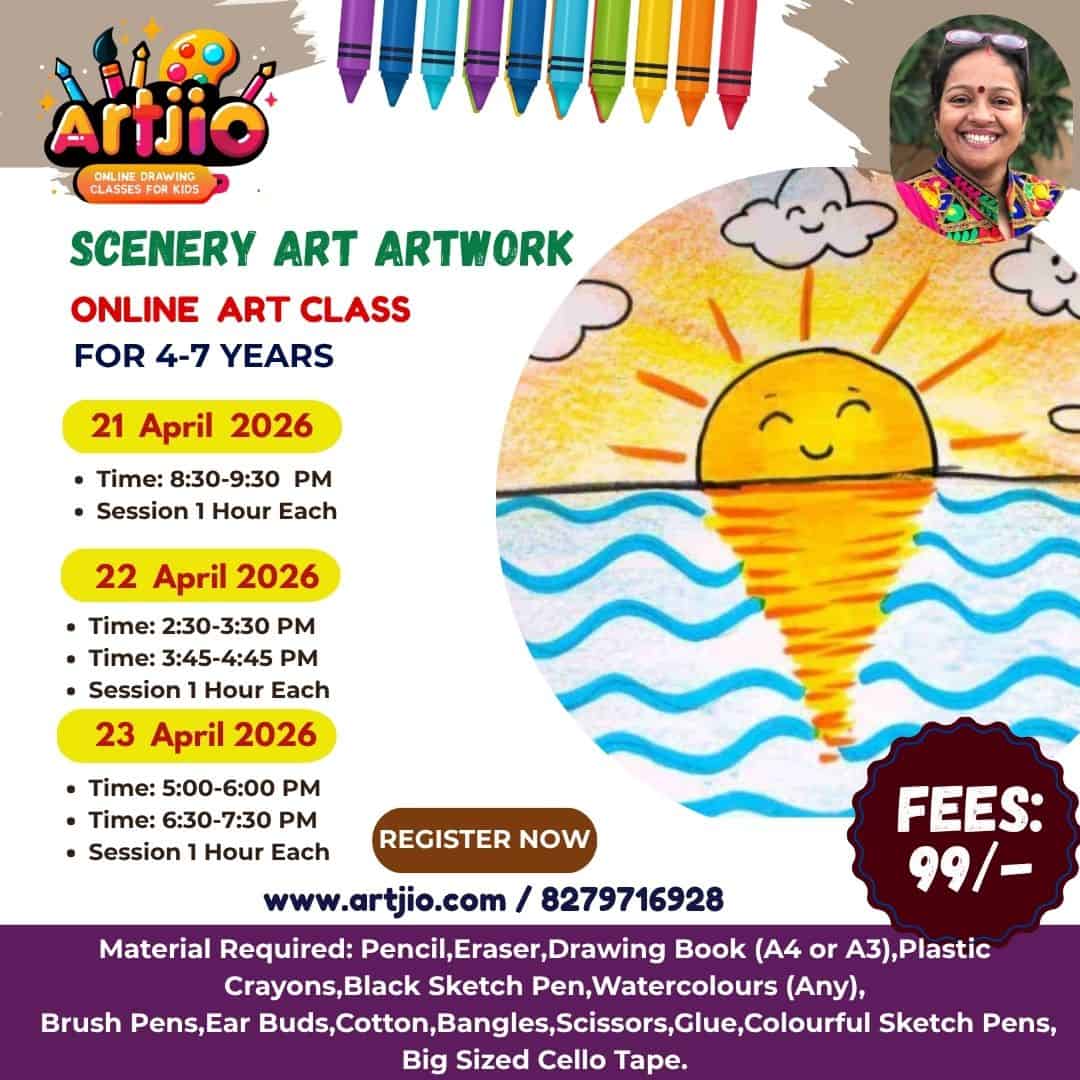 Specially designed for 4–7 years, this joyful and beginner-friendly art session introduces little artists to creating a beautiful scenery artwork. In this guided workshop, kids will draw a happy sun, flowing water, and cute clouds while learning basic composition and colouring techniques. This session makes learning art fun, simple, and full of imagination. (Artwork shown in the poster is for reference only.)