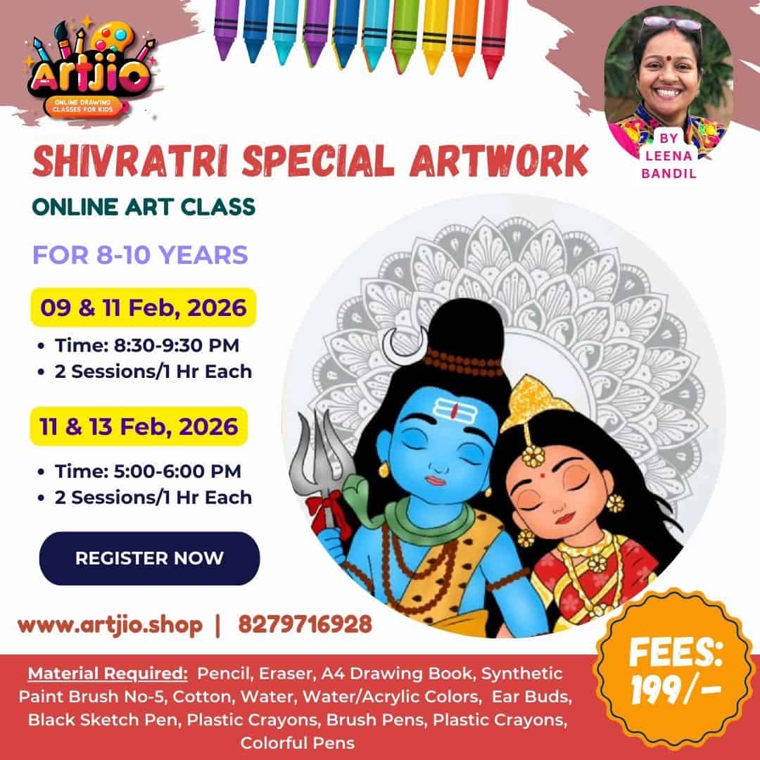 This Shivratri Special Artwork workshop is thoughtfully designed for kids aged 8–10 years to explore creativity while learning a beautiful devotional artwork inspired by Lord Shiva and Goddess Parvati.