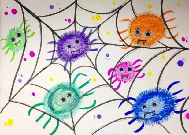 This fun and colorful drawing features a big spider web stretched across the page, with five cute and fuzzy spiders of different colors sitting on it. The spiders come in shades of orange, purple, pink, green, and blue, each with wiggly legs and big, round googly eyes that make them look playful and friendly. Some have tiny fangs, giving them a mischievous smile. The background is filled with splashes of yellow, purple, and pink dots, adding a lively effect. The drawing makes spiders look fun rather than scary, making it a great, exciting artwork for young children to enjoy.