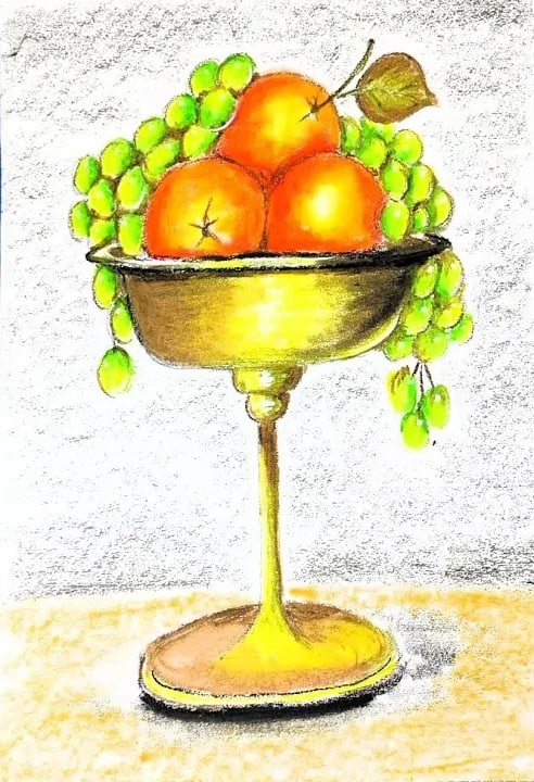 This elegant fruit still life artwork showcases a beautifully shaded bowl filled with fresh oranges and green grapes. The glowing oranges are carefully highlighted to create a realistic light effect, while the soft pencil shading around the background adds depth and texture to the composition. The golden stand of the bowl gives the artwork a classic still-life appearance. The delicate grapes hanging around the bowl bring balance and natural beauty to the scene. Through careful blending and smooth shading, the artist beautifully captures light, form, and freshness of the fruits. This artwork reflects strong observation skills and patience, making it a wonderful example of creative still life drawing practice exercise. 🎨🍊🍇