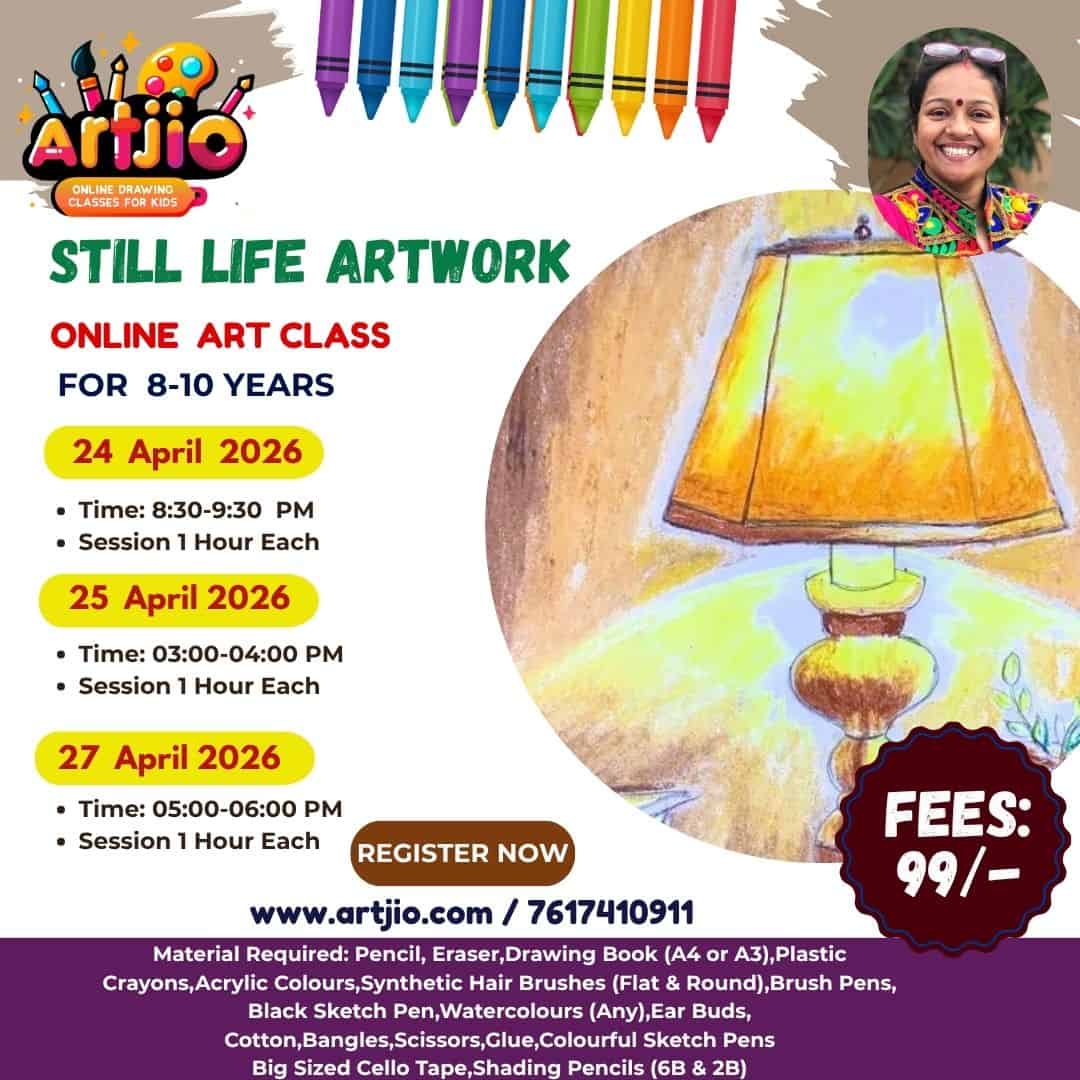 Specially designed for 8–10 years, this engaging and skill-building art session introduces young artists to the fundamentals of still life drawing and colouring. In this guided workshop, children will create a beautiful lamp artwork while learning how to observe shapes, light, and shadows. Step-by-step guidance helps kids understand composition and bring everyday objects to life with colours and shading. (Artwork shown in the poster is for reference only.)