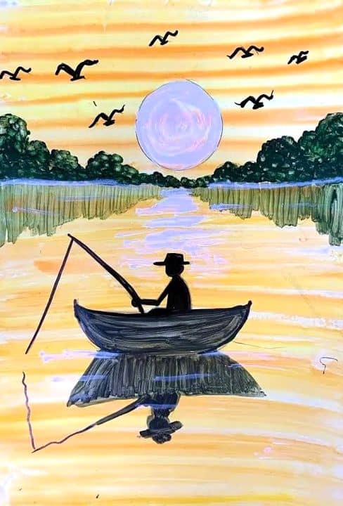 In this recorded session, children will learn to paint a beautiful sunset scenery featuring a fisherman in a boat, casting a line in calm waters. With the glowing sun, orange sky, flying birds, and tree-lined riverbanks, kids capture the magic of evening reflections. The use of silhouette painting makes the boat, fisherman, and reflection stand out against the colorful background, giving the artwork a stunning contrast. 🌞🌊This activity teaches color blending, reflection painting, and silhouette techniques, boosting creativity and artistic skills. Perfect for ages 8–10, the session combines simplicity with beauty, allowing kids to create a peaceful and inspiring masterpiece. 🌈💖
