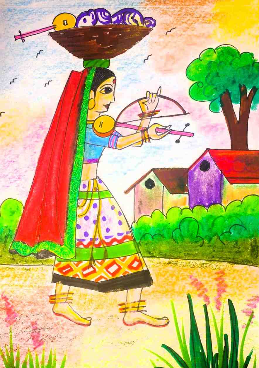 In this recorded session, children will learn to draw and color a beautiful village lady carrying a basket of traditional toys on her head and playing a local musical instrument. Dressed in vibrant ethnic attire with intricate patterns, this artwork captures the charm of Indian rural life and folk culture. 🪶🎶Step by step, kids explore proportion, detailing, and color harmony while learning to appreciate India’s artistic traditions. The bright colors, patterns, and village background make the artwork rich and cultural. Perfect for ages 10+, this session helps children connect with folk art themes, enhancing creativity, patience, and love for traditional Indian art. 🌈