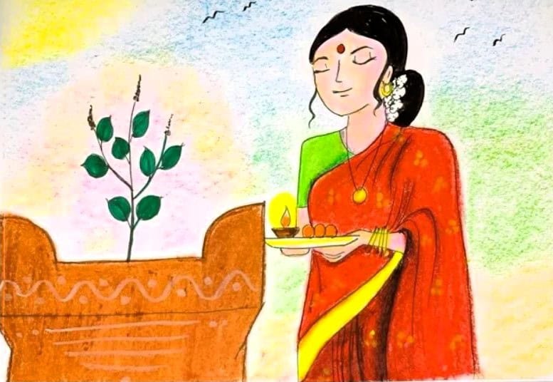 This beautiful artwork depicts a traditional Indian scene of a woman performing a Tulsi puja. She is dressed in a vibrant red saree with golden borders, complemented by a green blouse. Her black hair is neatly tied with jasmine flowers, and she wears a bindi, gold earrings, bangles, and a necklace. She holds a puja thali with a lit diya and sweets, symbolizing devotion. The sacred Tulsi plant stands in a decorated planter, signifying spiritual importance. The background has soft pastel hues, birds flying, and a calm atmosphere. This artwork represents faith, culture, and the deep-rooted traditions of Indian households.