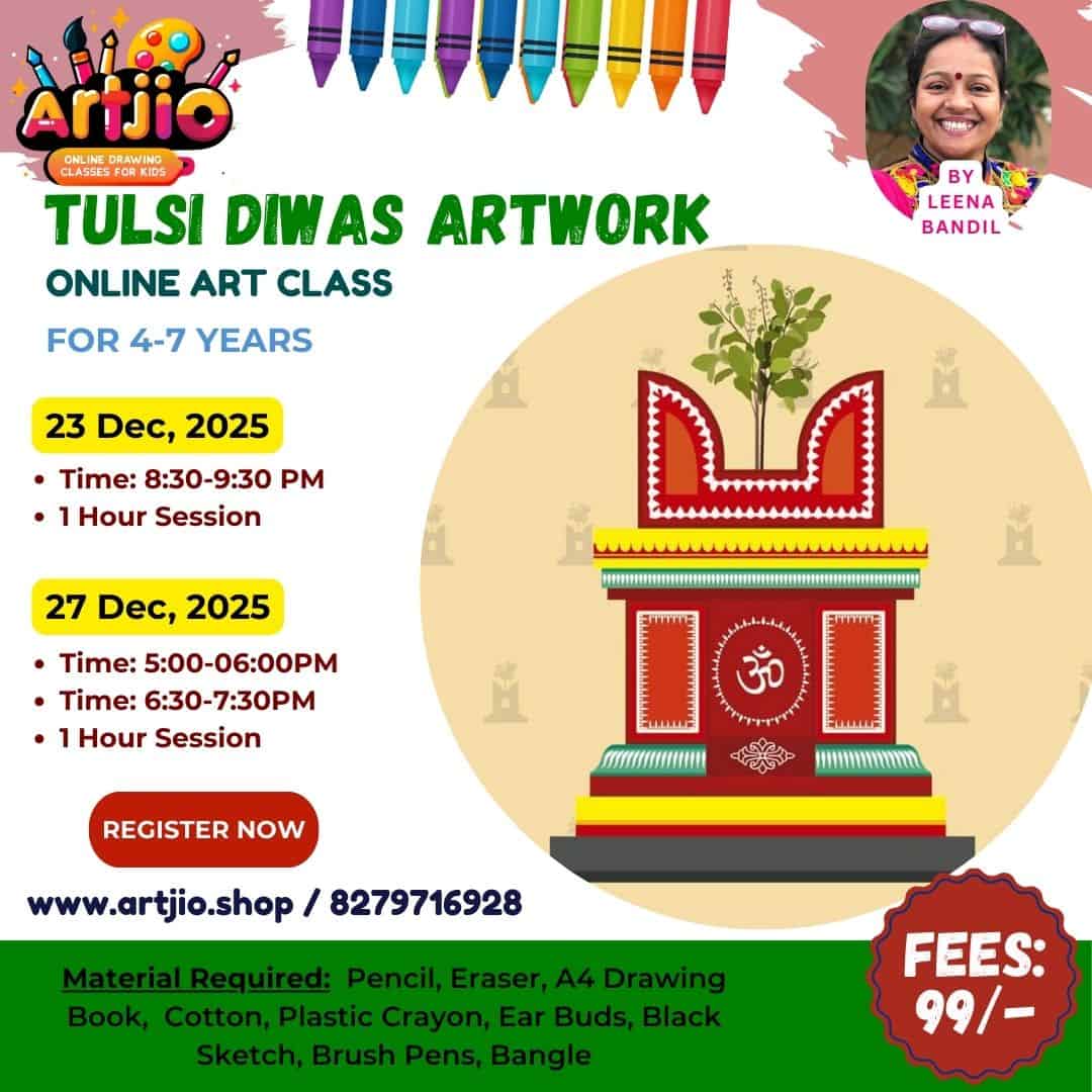 Specially designed for 4–7 years, this gentle and joyful Tulsi Diwas–themed art session helps young children learn about Indian traditions while enjoying drawing and colouring through a simple, step-by-step guided process. The session is beginner-friendly and focuses on fun, learning, and creative expression. The artwork shown in the poster is for reference only.