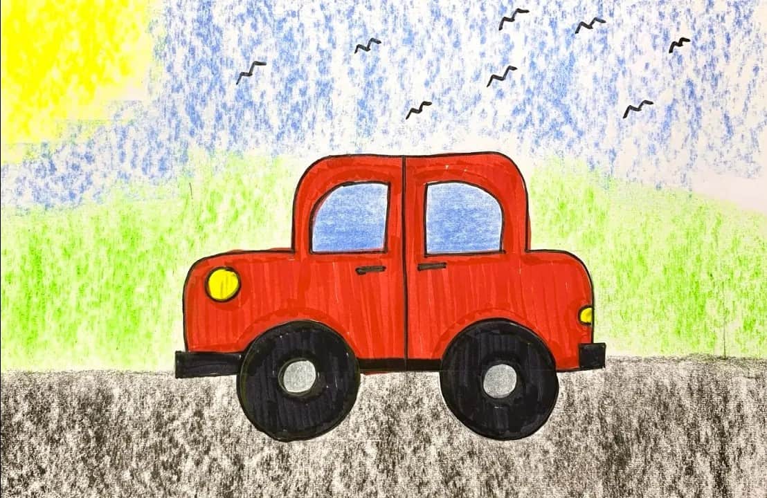 This cheerful and colorful artwork beautifully captures a simple red car driving along a sunny road. The bold red body, bright yellow headlights, and big black wheels make the car stand out clearly against the soft blue sky and fresh green background. The textured coloring style adds a charming hand-drawn feel, showing creativity and effort in every stroke. Flying birds in the sky and the shining sun bring life and movement to the scene. Through this activity, children practiced drawing basic shapes, outlining neatly, and filling colors evenly. This artwork helps improve hand control, observation skills, and confidence while making learning fun and exciting. 🌈✨