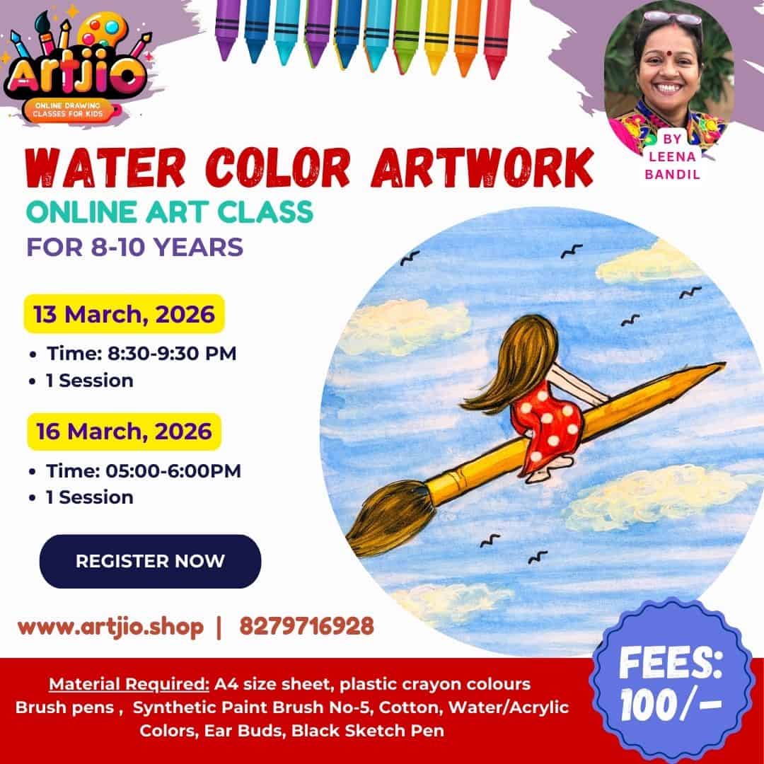 Specially designed for 8–10 years, this engaging art session introduces children to the beautiful world of watercolor painting. Through a guided step-by-step process, kids will create a dreamy artwork of a girl sitting on a paintbrush flying through the sky. This imaginative concept helps children explore watercolor blending, soft backgrounds, and creative storytelling through art. (Artwork shown in the poster is for reference only.)