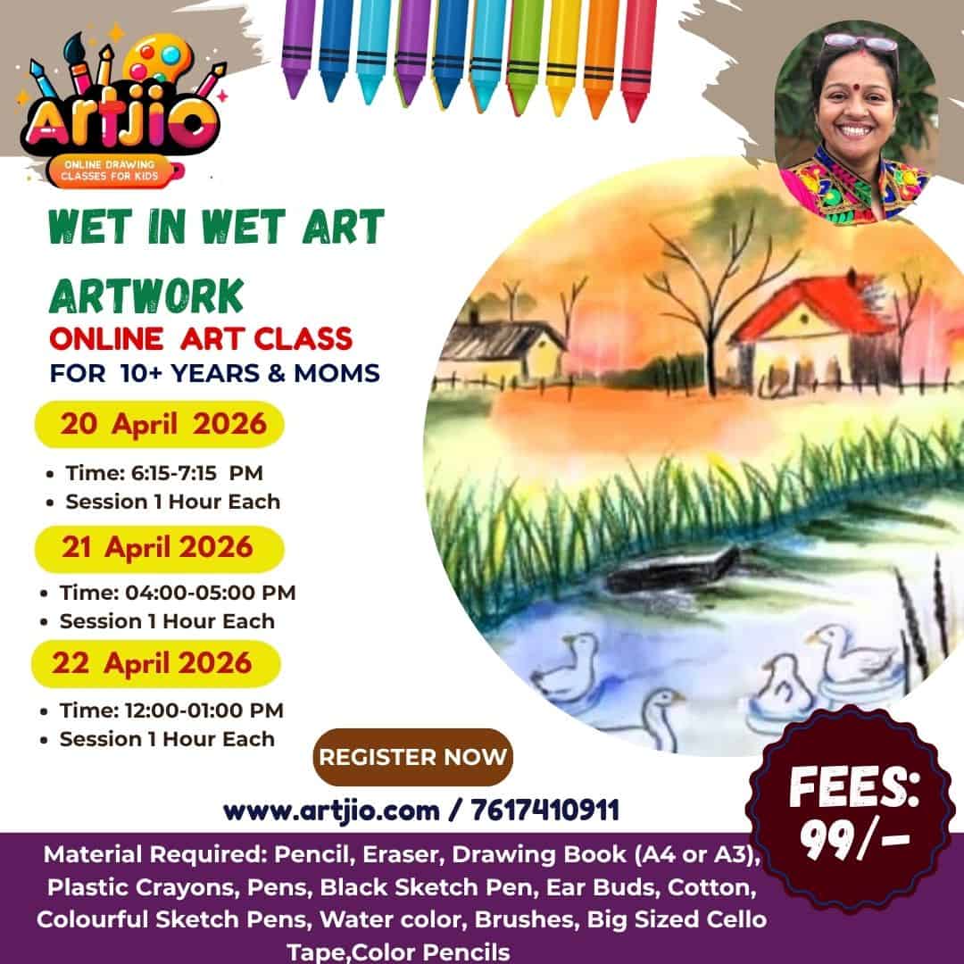 Specially designed for 10+ years & moms, this calming and creative art session introduces participants to the beautiful technique of wet-in-wet watercolor painting. In this guided workshop, learners will create a peaceful village scenery featuring houses, trees, water, and ducks while exploring soft blending and natural color flow. This session is perfect for relaxing, bonding, and expressing creativity together. (Artwork shown in the poster is for reference only.)