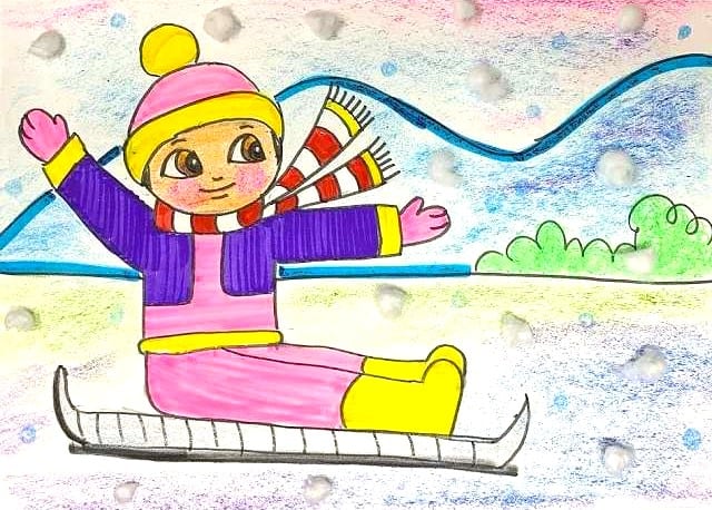 This is a colorful winter-themed drawing of a child sledding in the snow. The child is dressed in a warm pink and purple outfit with yellow boots and gloves. A red and white striped scarf wraps around their neck, fluttering in the wind. They are wearing a pink hat with a yellow pom-pom, and their cheeks are rosy. The child is smiling with excitement while riding a silver sled. In the background, blue mountains rise above a snowy landscape with green bushes. The sky has a soft blend of pink and blue, with white snowflakes gently falling, adding a magical winter feel.