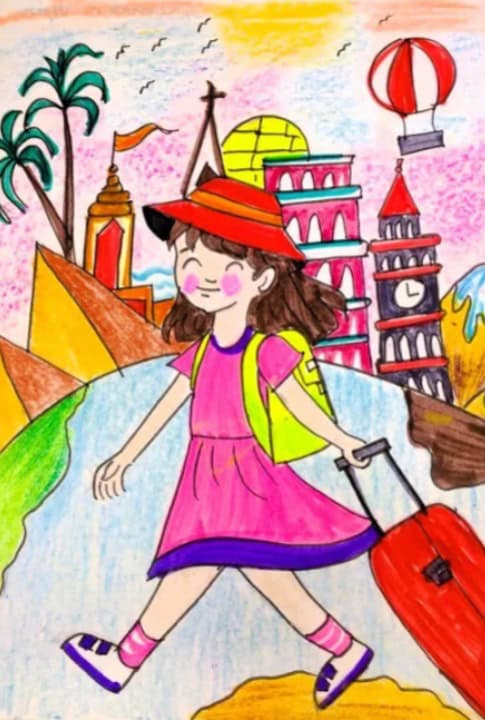 In this recorded session, children will learn to draw and color a young girl traveler with a hat, backpack, and suitcase, exploring the wonders of the world. The background features famous landmarks like the Leaning Tower of Pisa, Big Ben, pyramids, temples, palm trees, hot air balloons, and waves—capturing the spirit of adventure and discovery. 🗼⛵🎈Step by step, kids practice figure drawing, landmark sketching, and vibrant coloring, making the artwork lively and full of imagination. This session not only boosts artistic confidence but also inspires children to dream about traveling and exploring new cultures. Perfect for ages 8–10, it blends art with global adventure. 🌟🌎